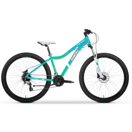 Rower wyposażony w lekką aluminiową ramę z technologią hydroformowania oraz kołami 27.5 cali, dostępny w dwóch kolorach – turkusowym i miętowym. Jego precyzyjny napęd SHIMANO z 16 biegami oraz hamulce tarczowe zapewniają płynność jazdy i bezpieczeństwo w terenie. Dodatkowo, aluminiowe komponenty i komfortowe siodło TABOU MTB sprawiają, że rower doskonale sprawdza się zarówno w trudnym terenie, jak i podczas długich wypraw.
