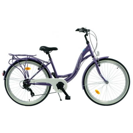 Ten stylowy rower z wytrzymałą stalową ramą w eleganckim fioletowym połysku łączy nowoczesny design z niezawodną funkcjonalnością. Napęd SHIMANO z 6 przełożeniami oraz lekkie, aluminiowe obręcze KANDS gwarantują płynną jazdę w każdych miejskich warunkach. Komfort użytkowania podkreślają ergonomiczne dodatki, takie jak profilowana kierownica, miękkie siodło i antypoślizgowe pedały z odblaskami.