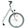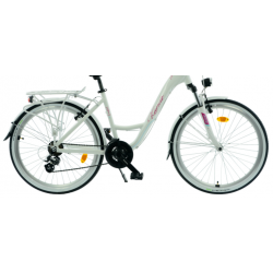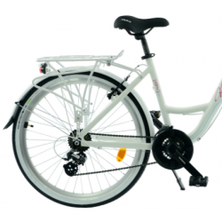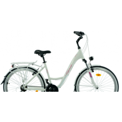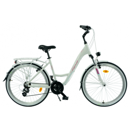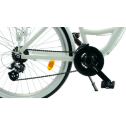 Ten rower KANDS wyróżnia się lekką aluminiową ramą w białym połysku oraz amortyzatorem o skoku 45 mm, który zapewnia komfort na nierównych trasach. Wyposażony jest w 21-biegowy napęd Shimano z precyzyjnymi przerzutkami i niezawodnym mechanizmem korbowym, co umożliwia płynną jazdę w różnorodnym terenie. Stabilność i bezpieczeństwo gwarantują 26-calowe koła z aluminiowymi obręczami oraz skuteczne hamulce V-brake, a dodatkowe wyposażenie podnosi komfort i funkcjonalność codziennych przejażdżek.