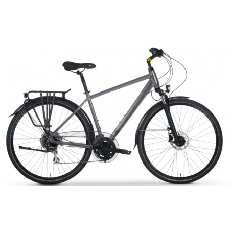Rower z aluminiową ramą 700C i technologią hydroforming łączy lekkość z wytrzymałością, oferując komfortową jazdę dzięki przedniemu widelcowi SUNTOUR NEX DS z 63 mm skokiem. Napęd oparty na komponentach SHIMANO, w tym mechanizmie korbowym ALTUS TY-501 i przerzutkach ACERA M360, zapewnia precyzyjne zmiany biegów w różnych warunkach terenowych. Z wysokiej jakości hamulcami tarczowymi SHIMANO MT200, ergonomicznymi akcesoriami oraz dodatkowymi funkcjami, jak dynamo AXA BASTA ECHO, rower ten łączy niezawodność, komfort i funkcjonalność na każdej trasie.