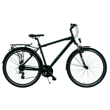 Ten rower z lekką, aluminiową ramą KANDS w matowym, ciemnozielonym kolorze łączy trwałość z nowoczesnym designem. Wyposażony w amortyzator SR Suntour M3010 o skoku 50 mm oraz precyzyjny napęd Shimano z 21 biegami, zapewnia komfortową i płynną jazdę na różnorodnych trasach. Solidne koła 28”, skuteczne hamulce V-brake oraz wygodne komponenty trekkingowe dopełniają funkcjonalności tego wszechstronnego roweru o wadze 17 kg.