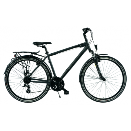 Ten rower wyposażono w lekką i solidną aluminiową ramę KANDS z amortyzatorem SR Suntour M3010 o skoku 50 mm, który skutecznie tłumi nierówności terenu. Napęd Shimano z 21 biegami oraz precyzyjne przerzutki Altus i Tourney gwarantują płynną zmianę przełożeń w różnych warunkach. Duże 28-calowe koła z szerokimi oponami DELI SA-300 zapewniają stabilność, a aluminiowe hamulce V-brake SACCON dbają o bezpieczeństwo i łatwość konserwacji.
