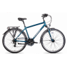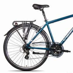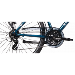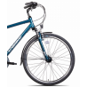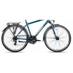 Ten męski rower trekkingowy z lekką aluminiową ramą 700C w niebieskim kolorze łączy wygodę codziennego użytkowania z solidnymi komponentami Shimano i komfortowym wyposażeniem. Dzięki 24-biegowemu napędowi oraz amortyzowanemu widelcowi SR Suntour z 50 mm skoku, doskonale sprawdza się zarówno na miejskich ścieżkach, jak i w lekkim terenie. Bogaty zestaw akcesoriów – oświetlenie AXA, bagażnik, błotniki i pompka – czyni go idealnym towarzyszem dojazdów i rekreacyjnych wycieczek.