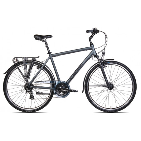 Ten wszechstronny rower trekkingowy łączy lekką aluminiową ramę 700C z komfortową geometrią i amortyzowanym widelcem SR Suntour M3010-A, idealnie sprawdzającym się w miejskich i podmiejskich warunkach. Bogaty 24-biegowy napęd Shimano z przerzutkami Tourney i Altus oraz zintegrowanymi manetkami EF500 zapewnia płynność jazdy w każdych warunkach terenowych. Pełne wyposażenie – od błotników i bagażnika po oświetlenie AXA i amortyzowaną sztycę – gwarantuje komfort, bezpieczeństwo i gotowość do codziennej eksploatacji.