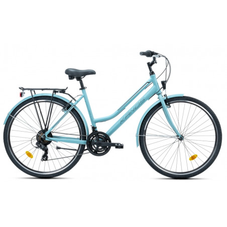 Rower KANDS w eleganckim błękitnym macie łączy lekką, aluminiową ramę z sztywnym widelcem, zapewniając stabilność i pewne prowadzenie zarówno w mieście, jak i na trasach trekkingowych. Wyposażony w 21 biegów i precyzyjny napęd SHIMANO TOURNEY oferuje płynną zmianę przełożeń, co ułatwia pokonywanie podjazdów i dynamiczną jazdę po płaskim terenie. Dodatkowo rower posiada wygodne komponenty, takie jak amortyzujące siodło DDK, oświetlenie LED, aluminiowy bagażnik i solidne hamulce V-brake, co czyni go funkcjonalnym i bezpiecznym wyborem na codzienne i rekreacyjne przejażdżki.